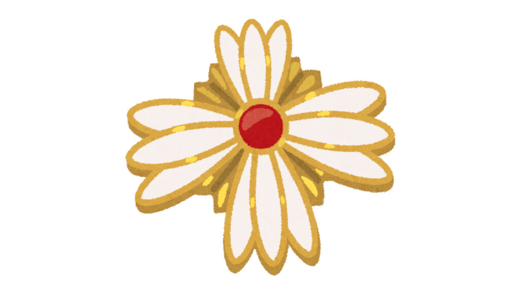 検察官のバッジは、紅色の旭日(朝日のこと)の周りに、白い菊の花びらと金色の葉があしらわれたデザインです。