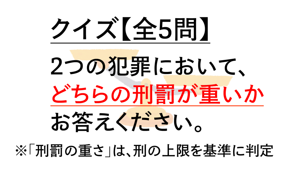 特に今回は「有期懲役」が科される2つの犯罪において、どちらの “上限年数” が大きいか・小さいかを推測してお答えいただければと思います。